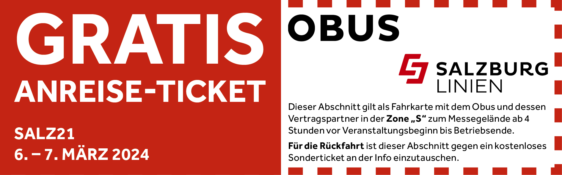 Ihr Salz21 Tagesticket berechtigt zur gratis Anreise mit dem Salzburger Obus zum Messezentrum Salzburg.