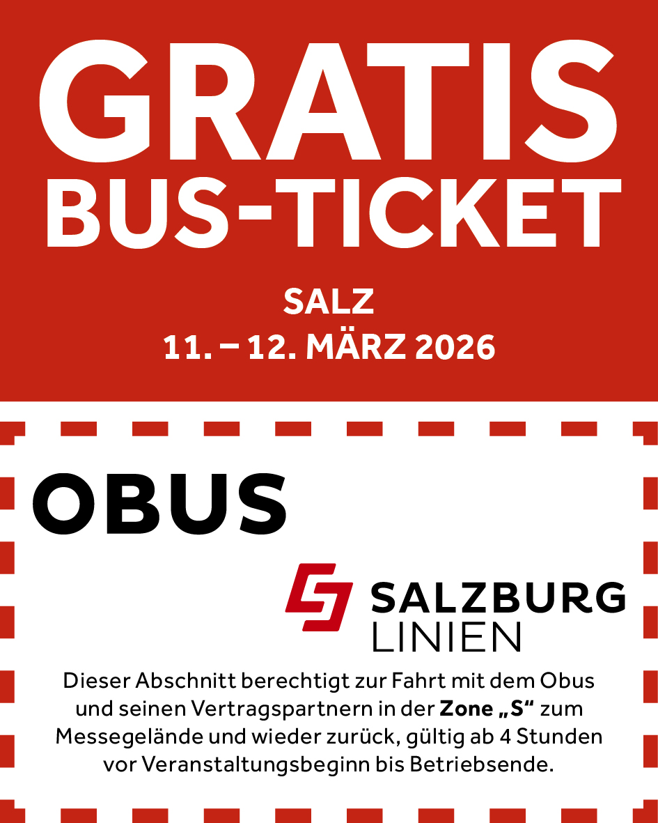 Ihr SALZ Tagesticket berechtigt zur gratis Anreise mit dem Salzburger Obus zum Messezentrum Salzburg.